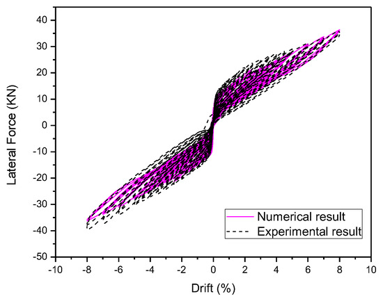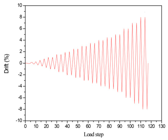 The loading was applied in two stages. During the first stage, a prestressing force was applied by using pre-defined field temperatures. During the second stage, lateral displacement-controlled cyclic loadings were imposed on the reference point of the loading block with pre-defined drift values. MPC constraints with tie connections were used for the reference point, and loadings in the models were the same as those conducted in the tests [47]. The loading cycle was conducted as the displacement control, and the drift levels included 0.1%, 0.2%, 0.3%, 0.5%, 0.75%, 1%, 1.5%, 2%, 2.5%, 3%, 3.5%, 4%, 4.5%, 5%, 6%, 7%, and 8%. Each drift was applied for two cycles; the model details are shown in Figure 4.