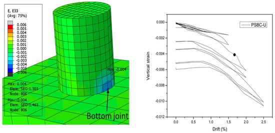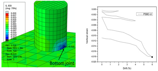 To accurately verify the proposed numerical model, the results are validated against the experiment [11]. In this study, the numerical models are calibrated against the experimental results in terms of force–displacement hysteric curves, as shown in Table 4 and Figure 5. The numerical model was able to capture the force–displacement response quite accurately in both the loading and unloading directions, with an overall error of less than 10%. The simulation results can effectively predict the horizontal bearing capacity, residual displacement, and ductility of PSBCs. The hysteric response at higher drifts is more complicated than at lower drifts; the numerical models usually have difficulty in accurately predicting the response at higher drifts. This study obtained excellent calibration, indicating that crucial features of PSBCs, such as concrete material models, reinforcement models, joint opening/closing mechanisms, and post-tensioning tendons, were modeled correctly. The simulation technique for bonding the tendons is well-established in the literature [38]. It involves embedding the bonded length of tendons within the surrounding concrete to simulate anchorage for unbonded tendons and full embedment for bonded ones. Model validation using the anchorage bonded technique demonstrated excellent calibration. Therefore, both the findings of this research and evidence from the literature are considered to validate the results of hybrid-bonded tendons in parametric simulations. Figure 6 shows the comparison of the compressive strain of the cover concrete. From the vertical strain distribution of the bottom section of the specimen, it can be seen that the compressive strain of concrete is concentrated at the bottom joint (the joint between the foundation and bottom segment). After selecting a node at the maximum strain position at the joint, the maximum compressive strain of the concrete reached a level of −0.004 for the first time when the displacement amplitude approached 1.73%. According to the performance target limits mentioned in Table 1, this threshold can be used as the calibration of performance target 1, which indicates that at a 1.73% displacement amplitude, the concrete cover at the joint position will peel off and be crushed.