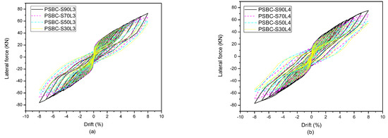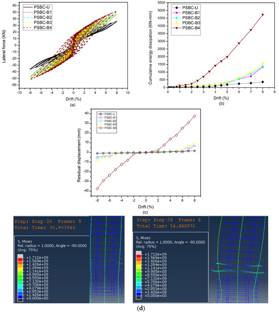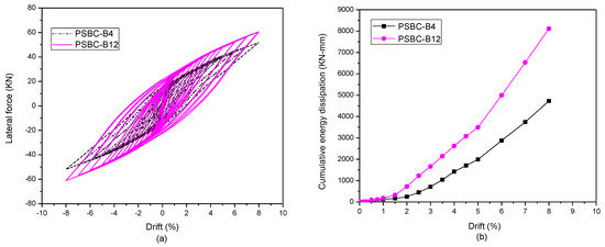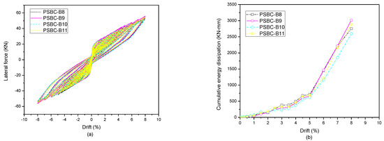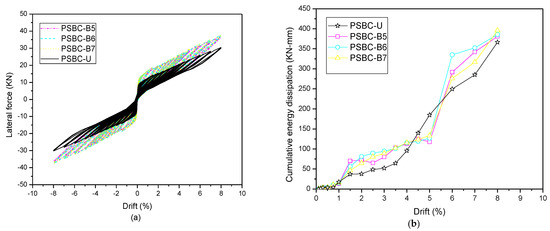 To quantitatively and qualitatively analyze the effects of hybrid bonding in non-plastic hinge regions, segment S-4 (which is the uppermost segment) was chosen to model the specimens. PSBC-B5, PSBC-B6, and PSBC-B7 with a 25%, 50%, and 100% length bonded across segment S-4 were selected for analysis. The results of the lateral force, energy dissipation, and response parameters are shown in Figure 9a,b, and Table 7.