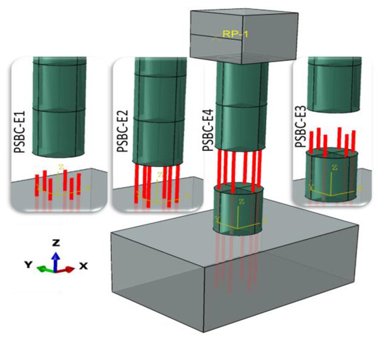 Here, 6D12 mm ED bars are added to the column, and specimens are denoted as PSBC-E1, PSBC-E2, PSBC-E3, and PSBC-E4, as detailed in Table 5. These bars start from the footing and extend to the middle and top of bottom segments 1 and 2, respectively, as shown in Figure 12. The ED bars are distributed evenly at a distance of 144 mm from the column center. ED bars are modeled with beam elements (B31); these bars are embedded in the surrounding concrete by using embedded constraints in a similar way to the longitudinal and transverse reinforcements, except for the equivalent (Leu) and additional unbounded length (Lau). Lau, 200 mm below the bottom segment, and Leu, 25 mm on both sides of the bottom segment joint, were selected for the model [34] to avoid the premature failure of the ED bars. In practice, PVC pipes or duct tape can cover the steel bars to separate them from the surrounding concrete. The elastic–perfectly plastic model was utilized for the ED bars, and the mechanical properties are shown in Table 9.