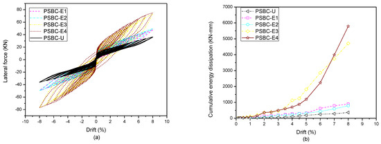The detailed hysteric and energy dissipation curves are shown in Figure 13a,b, and response parameters at the limit-state capacities and maximum drift ratio are shown in Table 10. Using ED bars helps increase the lateral strength and energy dissipation, respectively. A particular pattern develops, which can be stated as a increasing the length of ED bars in the bottom segment leads to similar ultimate lateral strengths and energy dissipation capacities because increasing the length decreases the strain in the bars [52]. It is accurate if the column is made of one segment or the bars do not cross more than one joint, as is the case with PSBC-E1 and PSBC-E2. However, when the length of the ED bars crosses more than one segment joint, increasing the length leads to an increase in the ultimate lateral strength and residual drifts, which results in the increased overall energy dissipation of the system, as can be seen in PSBC-E3 and PSBC-E4, respectively.