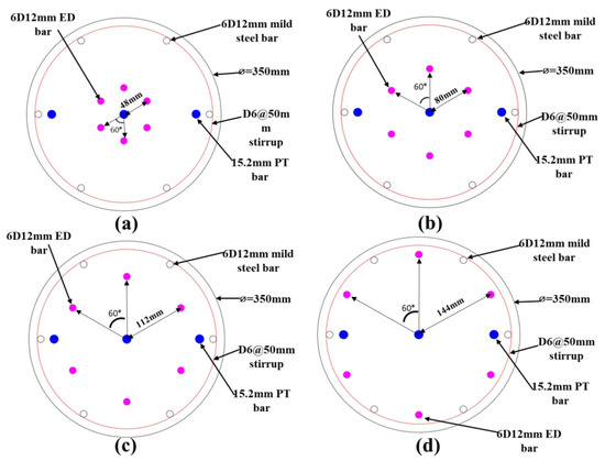 The addition of ED bars was an effective measure to increase the system’s bearing capacity and energy dissipation while maintaining its recentering abilities. This section presents a detailed parametric study focusing on the circumferential spreading of the ED bars with varying longitudinal lengths in the PSBC. The position of ED bars plays a vital role in the overall cyclic performance of PSBC as the behavior of ED bars changes with different distances from the column center. However, this fact has not been thoroughly studied for PSBCs so far. For this purpose, ED bars were added at a distance of 30%, 50%, 70%, and 90% of the core concrete circumference, as shown in Figure 14, and specimen details are shown in Table 5.