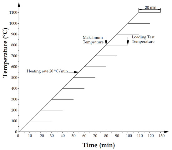 The samples underwent axial tension testing after reaching the target temperature and were maintained at that temperature for 20 min. The furnace heating rate was set to 20 °C/min. The furnace curve was incrementally raised from 23 °C to 1100 °C in increments of 100 °C, and the dwell time at the target temperature is presented in Figure 2. Following this, a steady-state tensile test was conducted, during which the temperature of the specimen was kept constant and the displacement rate was controlled at 0.3 mm/min [43].