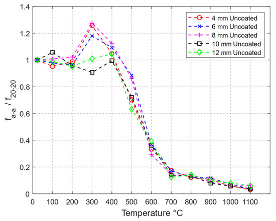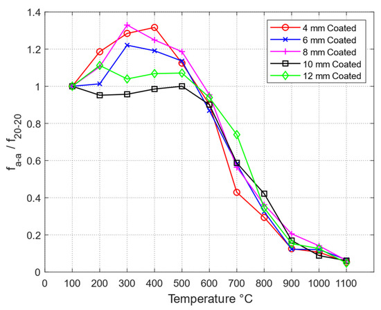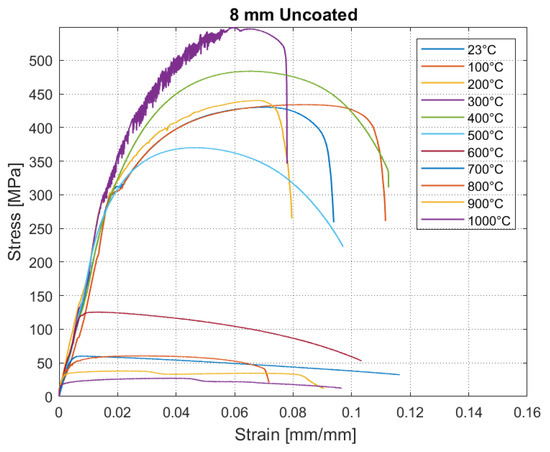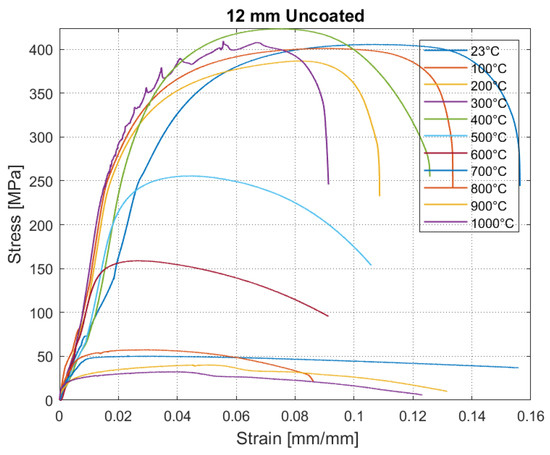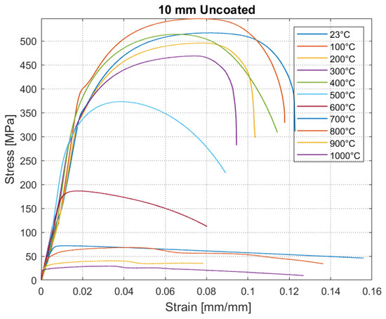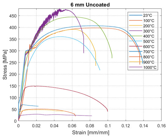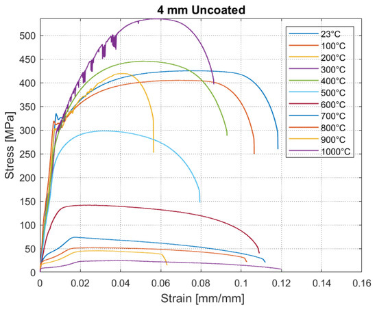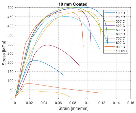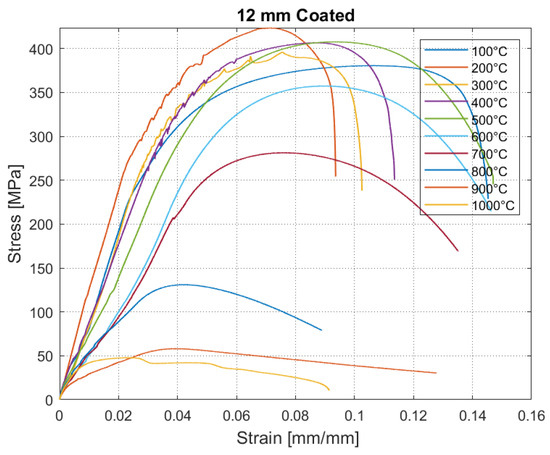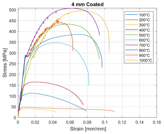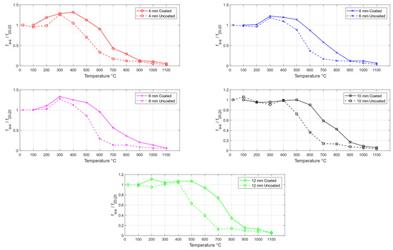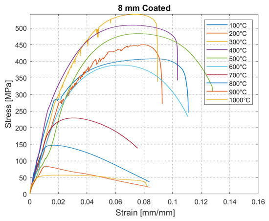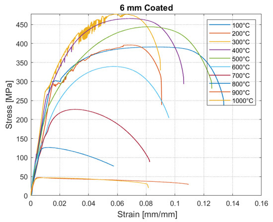 - When examining uncoated specimens separately, for specimen thicknesses up to 8 mm, an increase in mechanical properties was observed at temperatures of up to 300 °C, while for specimens thicker than 8 mm, mechanical properties reached their maximum at 400 °C. However, after these specified temperatures, there is a general decreasing trend up to 700 °C. Between 700 °C and 1100 °C, the trend of decrease is less steep.
