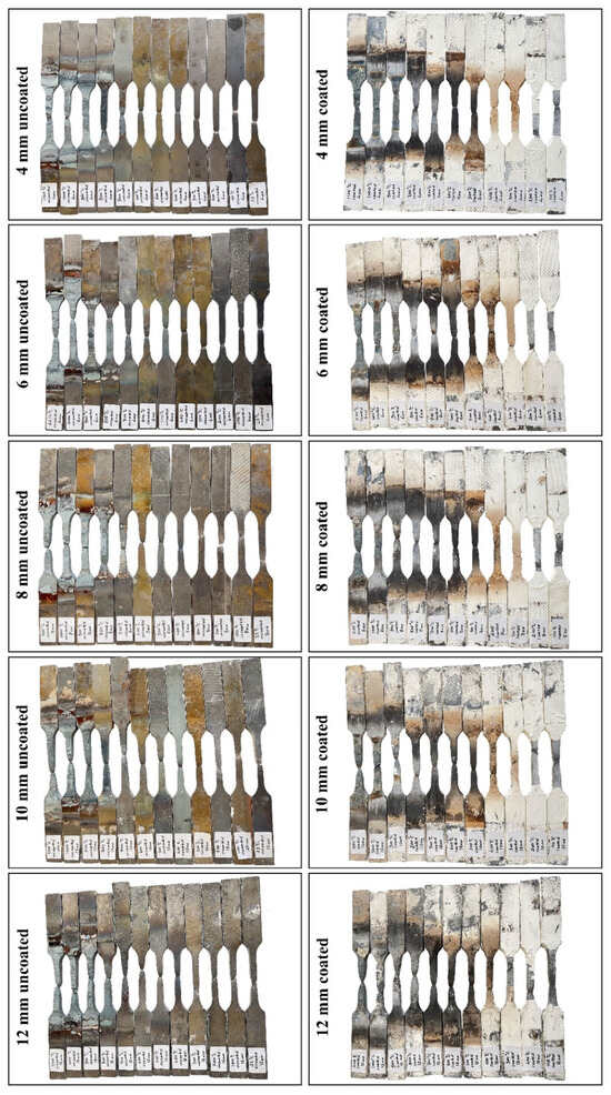 The tensile test specimens were prepared from S235 cold-formed steel (CFS) with thicknesses of 4, 6, 8, 10, and 12 mm (Figure 3). The samples were categorized into two groups: protected and unprotected. All surfaces of the protected test specimens received a gradual application of a water-based fire-retardant coat, which was approximately 250 microns thick. After the coating process, the coat thickness was checked using a coat thickness measurement device. For each thickness, a total of 115 tensile tests were conducted, including both coated and uncoated specimens, starting from 23 °C and increasing in 100 °C increments up to a maximum of 1100 °C.