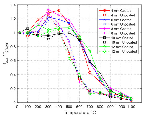 - Coated specimens consistently demonstrated higher strength values than their uncoated counterparts, particularly at temperatures ranging from 500 to 900 °C. This suggests that the coatings not only protect against thermal degradation but also contribute significantly to maintaining structural integrity under fire conditions. Notably, the onset of significant degradation in mechanical properties was observed at higher temperatures for coated specimens compared to uncoated ones, with coated specimens beginning to show strength losses at temperatures beyond 500 °C, compared to 400 °C for uncoated specimens.
