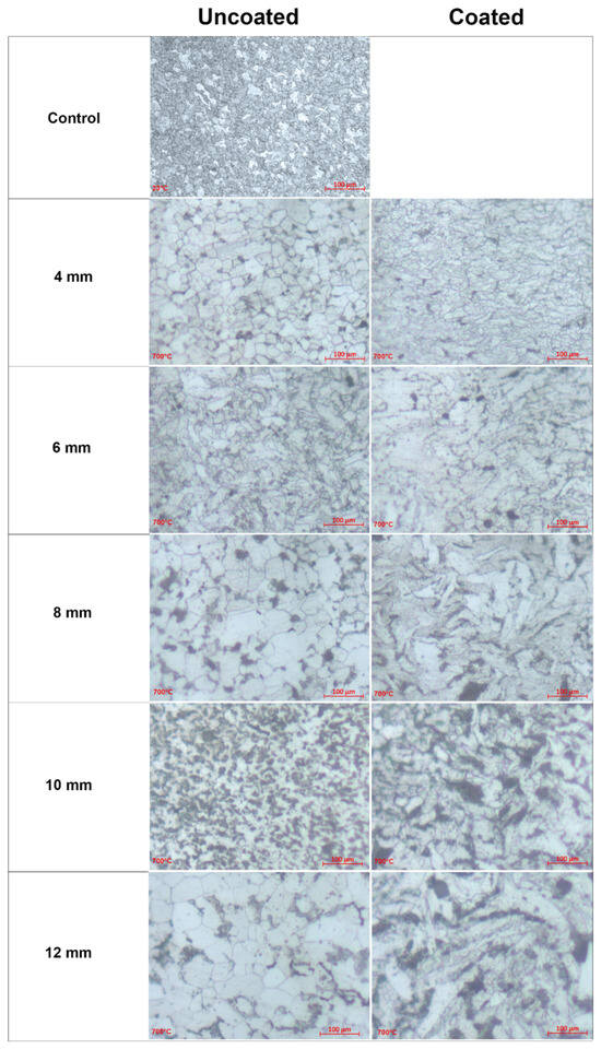 Comparing both painted and unpainted samples at 700 °C, the changes in grain structure correlate directly with the thickness of the specimens and the results from tensile testing. Coated specimens exhibit less degradation in microstructure compared to uncoated ones, suggesting that the intumescent coating provides effective thermal protection. This protection likely helps minimize grain growth and maintain microstructural integrity more effectively than in uncoated specimens.