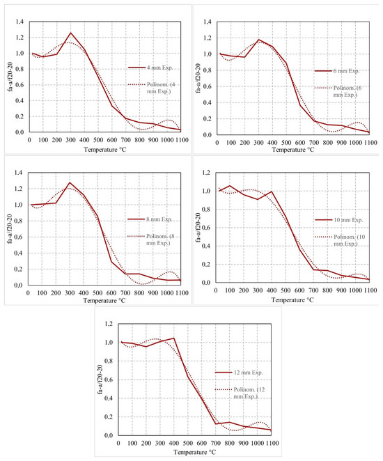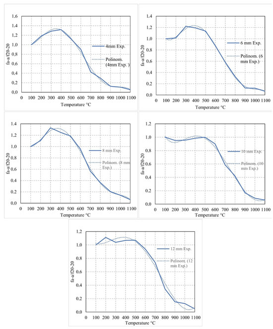 During the rising temperature phase in high-temperature sustained tests of S235 CFS, the ultimate strength reduction factor of S235 CFS reached its maximum value for the coatless specimens at 300 °C for thicknesses of 4, 6, and 8 mm, while specimens with thicknesses of 10 and 12 mm reached their maximum at 400 °C. For coatless specimens with thicknesses up to 8 mm, the temperature penetrated the material’s internal structure, reaching the maximum value in terms of reduction factor, at 300 °C. Increases in mechanical properties were observed at up to 300 °C for thicknesses up to 8 mm. However, for specimens with thicknesses of 10 and 12 mm, the maximum stress value was reached at 400 °C. After 300 °C, mechanical properties exhibited a decreasing trend. For coatless specimens with thicknesses of 10 and 12 mm, the temperature fully penetrated the material’s internal structure, reaching the maximum value in terms of reduction factor at 400 °C. For specimens thicker than 8 mm, increases in mechanical properties were observed until the temperature reached 400 °C. At temperatures higher than 400 °C, there was a declining trend in mechanical properties. The temperatures at which maximum values of the reduction factor were obtained vary according to material thickness. In Figure 8, when the reduction factor values at 600 °C are carefully examined for each thickness, it can be observed that the load-bearing capacity of the section increased as the material thickness increased.