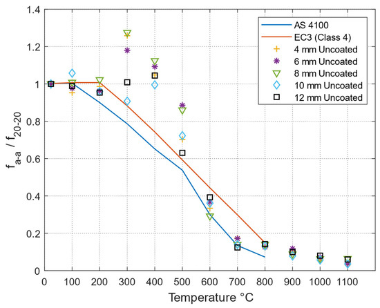 In this section, the reduction factor values for the maximum stresses obtained from the experimental data of S235 CFS under increasing temperature periods are compared with AS 4100 [51] and EC 3 [52] in Figure 22. In Figure 22, the reduction factor values for material property degradation during increasing temperature periods are presented. This not only reaffirms the principles laid out in the Eurocode but also provides a detailed, empirical backing for the theoretical predictions. By comparing our experimental data with the Eurocode performance criteria, we aim to bridge the gap between theoretical expectations and the real-world performance of intumescent-coated and uncoated CFS under fire conditions.