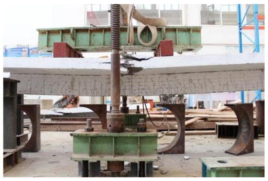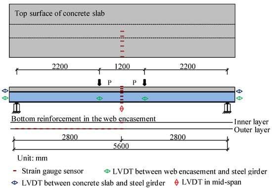 All PECB specimens were subjected to four-point bending, as illustrated in Figure 2. The load was applied in two phases: 20 kN/step until 70% of the estimated failure load, and then 5 kN/step until failure. In the experimental process, the applied load, mid-span deflection, maximum crack width, strain along the height of the mid-span section, strain along the width of the concrete slab, strain of tensile reinforcement in the concrete encasement and relative slip between the components of the composite beams were monitored.