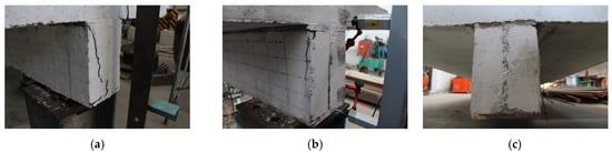 In all PECB specimens, the initial vertical crack appeared in the web encasement near the mid-span section at about 24% of the failure load. As the load increased, more cracks gradually developed and existing cracks extended upward at a moderate speed. At about 40% of the failure load, interfacial cracks appeared between the steel beam and the encasing concrete accompanied by a continuous sound, indicating that the natural bonding began to fail. When approaching about 90% of the failure load, cracks near the mid-span ran through the encasing concrete, and then transverse cracks turned up on the bottom of the concrete slab. Eventually, all PECB specimens failed due to the crushing of the concrete slab at the mid-span (Figure 3). For specimens PECB1 and PECB2, an obvious slip between the web encasement and the steel beam at the beam end was observed near the failure load (Figure 4a,b), while for specimen PECB3 no visible slip was observed during the whole loading process (Figure 4c).