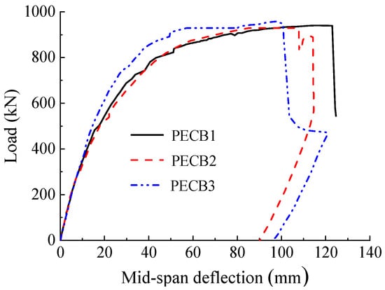 As shown in Figure 5, the load–deflection relationship of PECBs is generally divided into three stages: elastic, elastoplastic and plastic stages. The load–deflection curves develop almost linearly in the elastic stage. When about 35% of the failure load is reached, the load–deflection curves enter the elastoplastic stage, in which the deflection grows faster and the flexural stiffness degenerates gradually due to the acceleration of crack development and the yielding of the structural steel. After loading to 80% of the failure load, the load–deflection curves enter the plastic stage, in which the deflection grows dramatically with only a marginal increase in the load. By comparison, it can be concluded that the addition of studs on the steel web significantly slows down the stiffness deterioration of PECBs in the elastoplastic stage, while the flexural stiffness of PECBs is not obviously affected by the strength of the encasing concrete. It is worth noting that in the studies performed by Hu et al. [] and Kindmann et al. [], there is no significant difference in the stiffness deterioration of PECBs with and without studs on the steel web. It is indicated that, in the case of a large tensile reinforcement ratio, weak shear connections between the steel beam and the encasing concrete will lead to stiffness deterioration in PECBs.