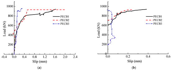 The variations in slip between the steel beam and the concrete encasement with the test load at the loading point and the beam end are illustrated in Figure 6a and Figure 6b, respectively. Different from the typical slip distribution law between the steel beam and concrete slab in a regular steel–concrete composite beam [,], the relative slip between a steel beam and its web encasement in PECBs tends to be larger at the loading point and smaller at the beam end, which is due to the fact that under the positive bending the encasing concrete cracks significantly near the loading point, resulting in discontinuous slip distribution. In the elastic and elastoplastic stages, the slip of all PECB specimens grows quite slowly and is basically less than 0.4 mm. In the plastic stage, the slip of the PECB specimen with stud connections on the steel web is still less than 0.4 mm, while the slip of PECB specimens with only natural bonding increases rapidly and eventually exceeds 1.6 mm.