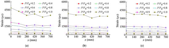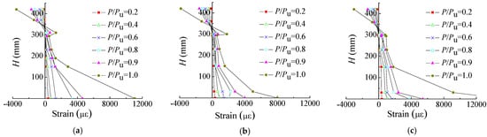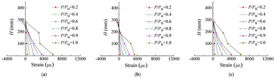Strain distribution along the height of the concrete encasement: (a) PECB1; (b) PECB2; (c) PECB3.