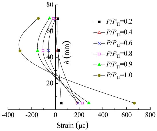 The strain distribution of the stud on the steel web in the shearing span of specimen PECB3 is shown in Figure 10, where the ordinate h is the distance from the stud root. It is shown that the strain of the stud increases with the load, whereas the maximum strain is far less than the yield strain of the stud up to the failure load. This indicates that natural bonding and friction forces play a considerable role in the transmission of longitudinal shear, and the maximum spacing of studs on the steel web specified by EN 1994-1-1 [] seems to be conservative.