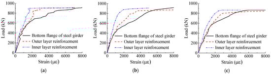 Load–strain curves of the bottom steel flange and tensile reinforcement: (a) PECB1; (b) PECB2; (c) PECB3.