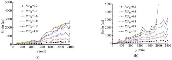 The strain distribution along the tensile reinforcement within the shearing span of specimens PECB1 and PECB3 was compared in Figure 12, where the abscissa y is the distance from the support. It is indicated that the strain distribution of the tensile reinforcement for specimen PECB3 is more linear, while for specimen PECB1 the strain of the tensile reinforcement near the support area basically no longer increases after 60% of the failure load. This is mainly due to the complete failure of the natural bonding near the support area, resulting in strain disharmony between the tensile reinforcement and the steel beam.
