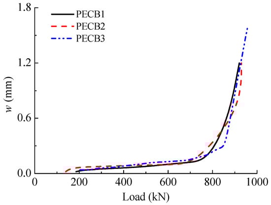 Figure 13 shows the development of the maximum crack width on the concrete encasement for PECB specimens, where w is the maximum crack width. Due to the constraints of the steel web and flanges, the maximum crack width develops quite slowly in both the elastic and elastoplastic stages of all PECB specimens. In the plastic stage of PECB specimens, when the tensile reinforcement in the web encasement is close to the yield strength, the crack width develops rapidly and the maximum crack width exceeds 1.2 mm under the failure load. In the service stage of PECB specimens, however, the maximum crack width is no bigger than 0.3 mm, which meets the requirements of the serviceability limit state for all exposure classes in EN 1992-1-1 []. The addition of studs on the steel web and the encasing concrete strength shows almost no effect on the development of the maximum crack width.