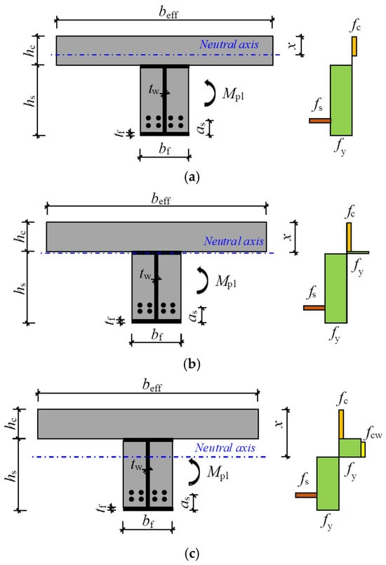For the three possible situations when the plastic neutral axis of the composite section locates within the concrete slab, the upper steel flange and the steel web, the stress distributions of the composite section are illustrated in Figure 14a–c, respectively, where Mpl is the flexural capacity predicted by the plastic theory; x is the distance between the plastic neutral axis and the top surface of the concrete slab; beff is the effective width of the concrete slab; bf is the width of the steel flange; hs and hc are the height of the structural steel section and the concrete slab, respectively; tf and tw are the thickness of the steel flange and the steel web, respectively; as is the distance between the center of the tensile reinforcement and the bottom of the structural steel; fc and fcw are the compressive concrete strength of the slab and the web encasement, respectively; and fy and fs are the yield strength of the structural steel and the tensile reinforcement, respectively.
