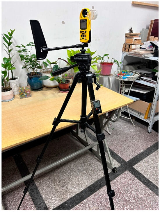 In this paper, the air and thermal environmental test was conducted on the building space of the case, and the time selected was from 8:00 to 18:00 on 29 July 2023, with a total of 10 h of uninterrupted testing. Using fixed monitoring, automatically record data every ten minutes, test parameters including temperature and humidity and air speed. Arrange 7 measuring points, distributed in the first floor outdoor, north and south side office space, and buffer space including: entrance hall, corridor, stairs, toilet. By comparing the indoor and outdoor temperature levels, the red solid circles are the measuring points of air temperature and air speed. The specific measuring point layout is shown in Figure 3. According to the “Standard for Testing Methods for Building Thermal Environment” JGJ/T347-2014 [19], the test height is the main activity height of personnel, 1.1 m from the ground, as shown in Figure 4. The name, photo, function, model, measurement range, and measurement accuracy of the test instrument are shown in Table 2.