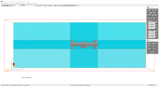Meshing significantly affected the simulation results. Intensive mesh division can improve accuracy., The main part should be denser, and the other parts can be sparse to reduce the computational burden. In this paper, a dense grid of 0.25 m × 0.25 m is used in the target model area, and the surrounding area is 0.5 m × 0.5 m. The total calculation area grid is about 15 million, the number of iterations is set to 1500, and each simulation calculation is about 6 h. In order to verify the influence of grid settings on simulation results, two control schemes were set: 1 m × 1 m grid in the target area, 2 m × 2 m grid in the surrounding area, 0.5 m × 0.5 m grid in the target area, and 1 m × 1 m grid in the surrounding area, as shown in Table 4. Each scheme was simulated and the air speed was used as the index for evaluation and comparison. It was found that the probe value results of the three different grids were 0.0242 m/s, 0.0225 m/s, and 0.0253 m/s, and the average air speeds of the whole region were 0.281 m/s, 0.315 m/s, and 0.306 m/s. As shown in Figure 5, it can be found that the grid change is relatively insensitive to the change in air speed, indicating that the simulation is robust. In order to improve the accuracy and speed of calculation, a dense grid of 0.25 m × 0.25 m was selected for the target model area, and the surrounding area was 0.5 m × 0.5 m, as shown in Figure 6.