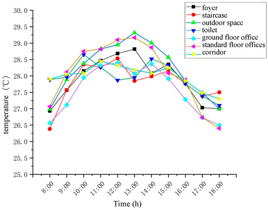After calculating the average temperature during the case building test, the hourly pattern can be obtained, as shown in Figure 7 and Table 5. According to the chart, during the test period, the outdoor temperature fluctuated between 26.9 and 29.3 °C, the peak appeared around 13:00, and the trough appeared around 18:00. The temperature fluctuation of the buffer space is between 26.3 and 28.81 °C, the peak appears at about 13:00 of the measuring point of the hall, and the trough appears at about 18:00. The temperature fluctuation of the main office space is between 26.4 and 29.1 °C, the peak appears at about 13:00 of the measurement point of the standard office, and the trough appears at about 18:00 of the measurement point of the standard office. Due to the noon shower during the test period, the temperature fluctuation occurred between 12:00 and 14:00, and the temperature of each test point generally showed a “rise-down” trend.