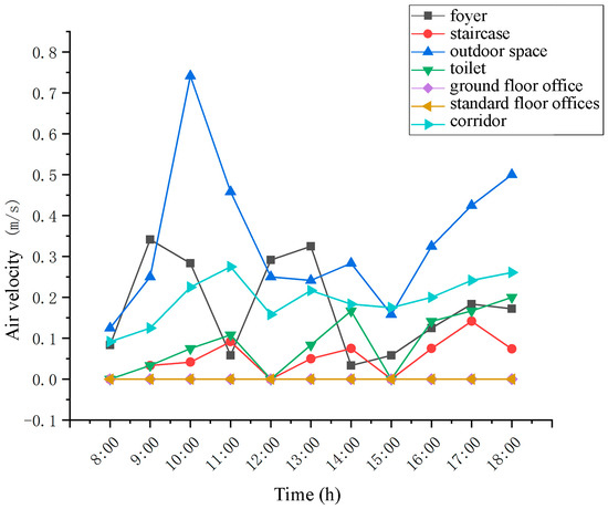After calculating the average air speed during the case building test, the hourly pattern can be obtained, as shown in Figure 8 and Table 6. It can be seen from the chart that in the air speed variation law, the time and size of the extreme value are different in different spaces. It can be seen that the fluctuation range of outdoor air speed is relatively large, 0.13~0.74 m/s, the peak is around 10:00, and the trough is around 15:00. The air speed fluctuation range in the buffer space is between the range of 0~0.34 m/s, and the peaks are around 9:00 and 13:00. During the test period, the doors and windows of the indoor office space are closed, resulting in the indoor air speed basically being 0 m/s, and the air mobility is poor.