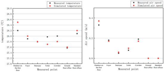 Firstly, the simulation verifies the error value of the measured and the simulated data to ensure the accuracy of the simulation; secondly, the simulation shows the effects of different buffer spaces on the indoor air speed and thermal environment; finally, the best buffer space combination is found through the combination of multiple variables. Build up the original model of the measured office building, as shown in Figure 9. In order to speed up the computer convergence speed, the model is simplified; the modeling content includes the internal and external walls of the building, column network, ground, floor, roof, and open the door holes and window holes on the wall. The simulation of the original model was performed according to the software setup and simulation requirements described above. After the simulation is completed, multiple points are selected for each buffer space and the average value is calculated to represent the average value of each space, as shown in Figure 10. The simulation results are shown in Figure 11. The measured values are strongly correlated with the simulated values, indicating that the parameter setting of the software is reasonable.