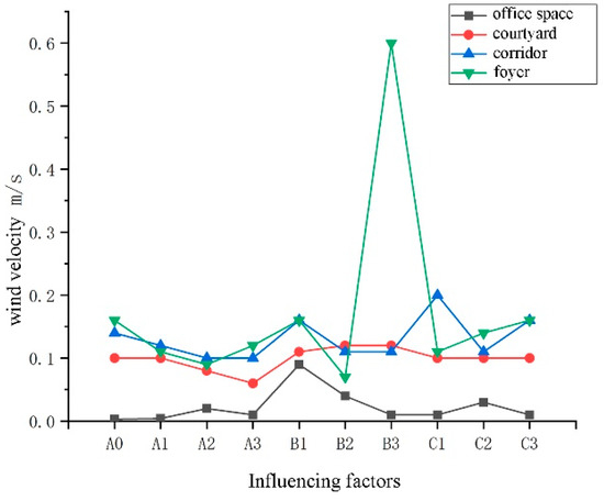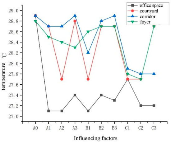 The magnitude of the range value in the range analysis method reflects the influence of each factor on the experimental results, and the greater the range, the greater the impact on the experimental results, and vice versa [36]. Range analysis can determine the primary and secondary relationships between each factor in the indoor environment, and it can determine the optimal combination through the results of range analysis. Taking the indoor air speed as the evaluation index, it was concluded that the influence of each buffer space on the air speed of the indoor space was as follows: courtyard > corridor > foyer. The optimal levels are corridor (A3), courtyard (B2), and foyer (C2), as shown in Table 11. When the temperature was used as the evaluation index, the results of the influence of each buffer space on the temperature of the indoor space were obtained as follows: courtyard > corridor > foyer. The optimal levels are corridor (A1), courtyard (B3), and foyer (C1), as shown in Table 12.
