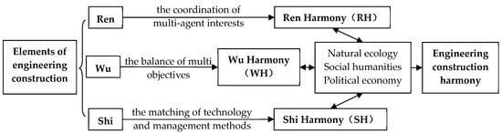 Engineering construction harmony embodies the core concept and essence of traditional Chinese culture. It is a process of coordinating and solving many contradictions among the elements of Ren, Shi, and Wu and between them and the environment. The content of engineering construction harmony includes (1) “Ren harmony”, which is the coordination of multi-agent interests of “Ren” in engineering organization; (2) “Wu harmony”, which is the multi-constraint objective balance of the project and its “Wu” elements; and (3) “Shi harmony”, which is the matching of “Shi” elements such as engineering construction technology and management methods. Then, on the basis of the three subsystems of RH, WH, and SH, the harmony between the subsystems and the external environmental factors of natural ecology, social humanities, and political economy is realized so as to achieve engineering construction harmony under the joint action of Ren, Shi, and Wu.