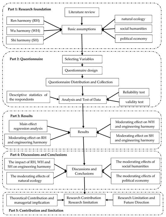 In all, the subsystems of “Ren-Shi-Wu” are restricted by the external environmental factors of natural ecology, social humanities, and political economy. The coupling of the three subsystems and the external environments can ultimately achieve engineering harmony. Engineering construction harmony strives to realize the RH, WH, and SH, as well as their harmony with external environmental factors, thus promoting the realization of the comprehensive benefit goal of the project. The realization degree of engineering construction harmony can be evaluated by the “harmony degree” [,]. However, “harmony degree” is a relatively vague concept. The concepts of RH, WH, and SH in engineering harmony are also relatively abstract. How the three subsystems of RH, WH, and SH affect the realization of engineering harmony objectives, and how the external environmental factors such as natural ecology, social humanities, and political economy affect and adjust the influence mechanism of RH, WH, and SH on engineering harmony need to be further explored.