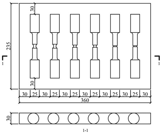 As shown in Figure 4, notched round bar specimens with a gauge length part of Q460D steel were extracted from a 30mm thick hot-rolled steel plate that belonged to the same batch of material as the Q460D steel introduced in Section 3.1. As shown in Figure 5, two Q460D steel plates with thicknesses of 30 mm that belonged to the same batch of material as the steel introduced in Section 3.1 were welded with ER55-G butt welds that belonged to the same batch of material as the welds introduced in Section 3.1. The welding process was the same as that in ref. [], which was determined according to ref. []. The welding quality reached the first grade. Notched round bar specimens with a gauge length part of ER55-G weld were extracted from the welded steel plate in a direction vertical to the weld length direction, as illustrated in Figure 5. Referring to ref. [], the design dimensions of the specimens with notch radii of 6.25 mm, 3.125 mm, and 1.5 mm, respectively, are depicted in Figure 6.