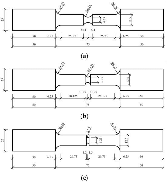Design dimensions of notched round bar specimen (mm). (a) R = 6.25 mm. (b) R = 3.125 mm. (c) R = 1.5 mm.