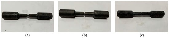 The notched round bar specimens were put into the high-temperature device shown in Figure 2. The treatments of thermal exposure and subsequent natural cooling of the notched round bar specimens were consistent with those of the coupon test specimens introduced in Section 3.1. Figure 7 presents photos of representative notched round bar specimens following their exposure to elevated temperatures and natural cooling.