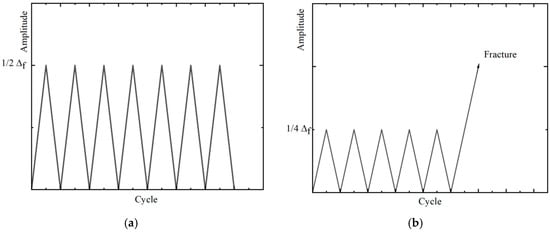 The deformation of the specimen’s gauge length part was used to control loading. According to ref. [], two types of loading protocols, CL-1 and CL-2, were adopted, as shown in Figure 9. In Figure 9, Δf is the fracture deformation of the gauge length part of the notched round bar specimen under uniaxial tensile load. 1/2Δf was adopted as the loading amplitude of CL-1, while 1/4Δf was adopted as the loading amplitude of CL-2. During the cyclic test using loading protocol CL-1, the deformation of the specimen’s gauge length part was cycled between 0 and the loading amplitude until failure occurred. During the cyclic test using loading protocol CL-2, the deformation of the specimen’s gauge length part was cycled between 0 and the loading amplitude for five cycles and then a tensile load was applied to the specimen until failure occurred. Table 3 shows the number, measured dimensions, and loading amplitude of each notched round bar cyclic test specimen.