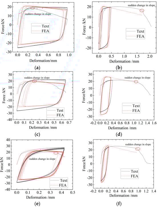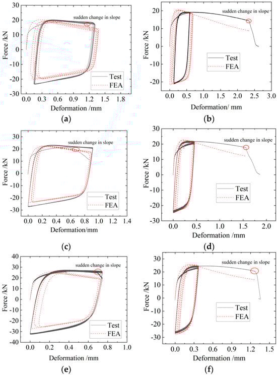 The force–deformation curves from the FEA and the tests, as illustrated in Figure 10 and Figure 11, displayed a good agreement for most of the specimens, while the deviation of the FEA curve with the test curve of specimen QZ-W-4 was relatively large. The reason for this may be that the parameters Q∞ and b used in the FEA were obtained from a trial process, and occasionality always occurs in this test.