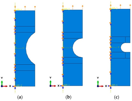 FEA model of notched round bar specimens. (a) R = 6.25 mm. (b) R = 3.125 mm. (c) R = 1.5 mm.