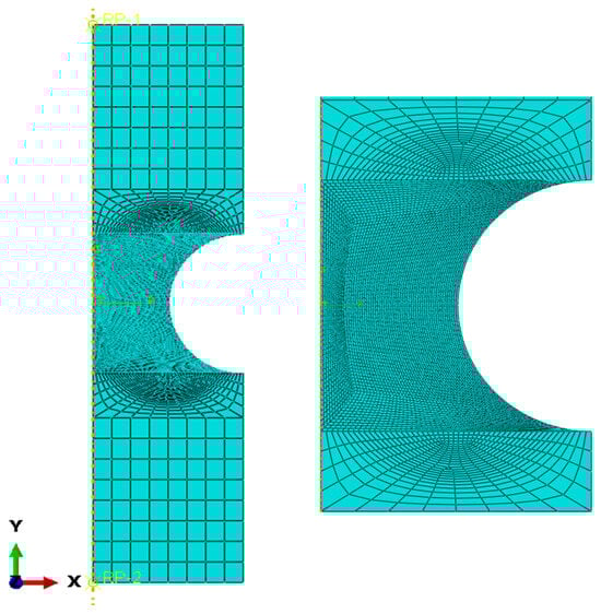 Here, the current elastic range σ0 is defined as a function of the initial elastic range , εp is the equivalent plastic strain, and Q∞ and b are two parameters. Isotropic hardening was determined by entering the values of and b in the “CYCLIC HARDENING” option in ABAQUS. The values of Q∞ and b were determined by a trial process to achieve the best agreements between the notched round bar force–deformation curves obtained from the experiments and the FEA, as shown in Table 4. A two-dimensional, axisymmetric FEA of the specimen’s gauge length part with an element type of CAX8R was conducted, as shown in Figure 12. The top and bottom sections of the finite element model were specified as rigid and tied to the reference points at the center of the top and bottom sections, respectively. The bottom reference point was completely fixed. The constraints on degrees of freedom U1, U3, and UR2 along the symmetric axis wwereenforced, allowing only movement in the U2 direction. The top section was subjected to a load causing displacement solely along the U2 direction. The initiation of ductile fracture could be predicted when the CVGM was satisfied over the characteristic length . The influence of cyclic loading on the value of was difficult to determine, and the value of was taken to be the same as that under monotonic loading []. According to ref. [], the mean values of of Q460D steel and ER55-G welds following exposure to 900 °C and subsequent natural cooling are 0.162 mm and 0.124 mm, respectively. The finite element model utilized these measurements as the element sizes at the critical notched region of the specimen. For areas deemed non-critical, larger element sizes were used to enhance the computational efficiency, as depicted in Figure 13.