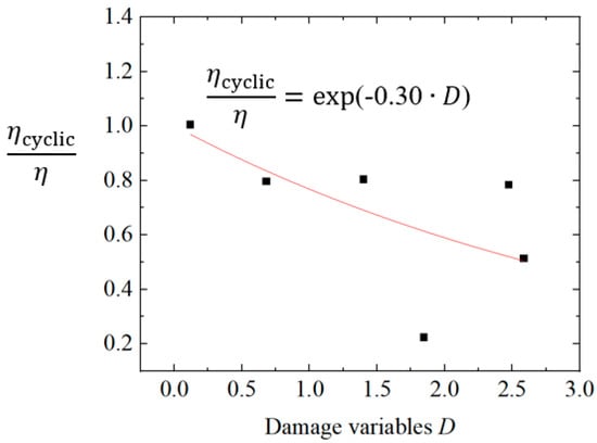 In the CVGM, the ratio of can be directly used as the damage ratio, and the equivalent plastic strain value at the start of the final tensile cycle is taken as the damage variable D. The functional relation Equation (4) of D and can be obtained by fitting them with the least square method; then, the of the CVGM can be obtained.