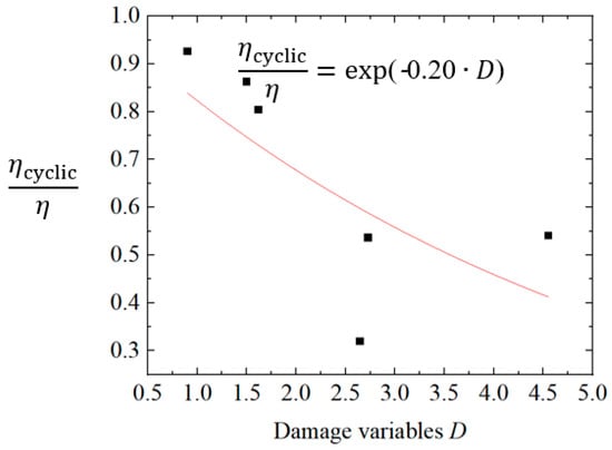 When fracture initiation occurred, the value of equaled that of . According to ref. [], the values of parameter of the VGM of Q460D steel and ER55-G welds following exposure to 900 °C and subsequent natural cooling were 1.52 and 2.74, respectively. The ratio of at the failure point to was used to estimate the damage ratio of each specimen and the equivalent plastic strain at the start of the final tensile cycle of the specimen was designated as the damage variable D. A graphical representation was created to display the relationship between the damage ratio / and the damage variable D. This process was repeated for all the notched round bar cyclic tests of Q460D steel and ER55-G welds, respectively. The results of these analyses are summarized in scatter plots illustrated in Figure 15 and Figure 16, respectively. Utilizing a least squares fit, the damage ratio was determined as a function of the damage variable. Equation (4) represents an exponential function adopted for the damage function. Figure 15 and Figure 16 display the exponential curve fitted to the scatter data. This method facilitated the determination of the damage degradation parameter, denoted as , for each material. Following exposure to 900 °C and subsequent natural cooling, the values of were found to be 0.30 for Q460D steel and 0.20 for ER55-G welds.