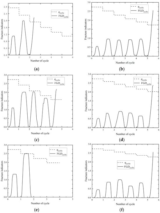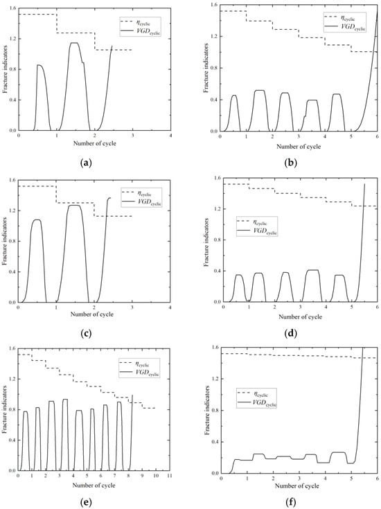 Based on the FEA calculation results, von Mises stress, principal stresses in three directions, and equivalent plastic strain of the most dangerous element were extracted. According to Equations (2) and (3), the cyclic void expansion capacity at each tensile cycle’s start and the damage accumulation under tensile–compressive cyclic loading were calculated, respectively, and when the difference between and was greater than 0, it could be predicted that fracture initiation occurred. Figure 17 and Figure 18 show the relationship of the fracture indicators including and to the number of cycles. In Figure 17 and Figure 18, the fracture indicator decreases with the increase in the number of cycles. When the curve representing intersected with the curve representing , fracture could be predicted to occur.