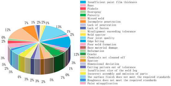 Currently, the entire lifecycle of quality control of steel prefabricated components is essential to ensuring the success of the construction project. The process comprises three primary phases: production, transportation and storage, and on-site construction, each of which employs specific control measures to guarantee the quality and performance of the components []. During the production stage, starting with the selection and inspection of raw materials, every phase of the process must be executed precisely, including cutting, forming, welding, and surface treatment, to ensure that the size, shape, and quality of the components meet the design requirements. Quality inspection methods include ultrasonic testing [] to detect internal defects in component welds and materials, magnetic particle testing [] to detect indicative defects in component welds and materials, and 3D laser Doppler vibrometry (3D LDV) [], a non-contact measurement that enables real-time monitoring of the dynamic properties of products to assess their structural integrity and production quality. Destructive testing consists of tensile, flexural, and impact tests to verify that the component’s performance meets the requirements for use []. Secondly, quality testing during the transportation and storage phases is critical to ensure that the integrity and performance of the components are not compromised before they arrive at the construction site. This includes visual inspection techniques that utilize high-resolution cameras and drones to provide clear images from multiple angles [], which help to inspect surfaces for corrosion, scratches, or other damage caused by transportation. Finally, during the field construction phase, quality inspection is crucial to ensure the safety and durability of the overall structure. The utilization of advanced technologies has led to the widespread use of innovative inspection methods and equipment in the quality control of on-site construction. For instance, the mobile test station [] employs the impulse excitation technique (IET), which is an effective and cost-effective means of inspecting components in the field. This approach is suitable for a multitude of situations, including storage, and has proven to be a useful tool in quality control. Despite the existing quality inspection tools and methods being relatively comprehensive and primarily focused on identifying and eliminating substandard components, these measures are primarily reactive in nature and do not offer effective prevention and control of the quality risks associated with structural steel components. In particular, the production stage of front-end quality control for steel components presents numerous and complex challenges [], as illustrated in Figure 1, which depicts the various quality issues encountered by a component production plant in Changchun, Jilin, China. These issues, if not properly categorized and managed, limit the ability of enterprises to recognize and manage potential risks during the production phase of assembled steel structure components, thereby impacting the overall safety and reliability of assembled steel structure buildings. To address these challenges, this paper will employ FBN and design a risk analysis framework by integrating the noisy-OR gate model and SAM.