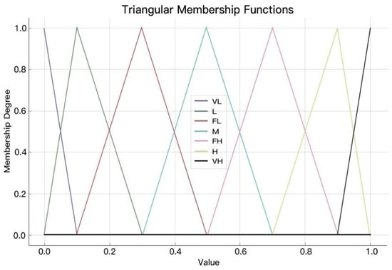 Fuzzy set theory (FST), introduced by Zadeh [] in 1965, is designed to address uncertainties caused by imprecision and vagueness, making it ideal for scenarios characterized by uncertainty, subjectivity, or incomplete information [,,]. In risk assessment, fuzzy theory is utilized to quantitatively analyze risk factors that cannot be precisely quantified [,] and has been established as a vital tool in this field []. The integration of fuzzy theory with BNs has resulted in the creation of FBN, which enhance the ability to manage uncertain information and broaden their use in complex decision-making. In FBNs, the selection of suitable fuzzy probability measures is critical []. Prominent fuzzy numbers currently employed include triangular fuzzy numbers [], trapezoidal fuzzy numbers [], and Gaussian fuzzy numbers [], with triangular fuzzy numbers being widely favored for their advantages in processing imprecision and ease of computation. This research adopts triangular fuzzy numbers to express the probability of event occurrences. The function image is depicted in Figure 2, and the membership function is defined in Equation (3):