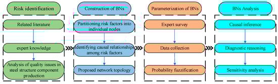 To comprehensively assess the quality risks associated with the production of prefabricated steel structural components, the model construction encompasses four steps. Initially, potential risks and their causative factors are identified through a literature review and expert consultation. Subsequently, a BN model that links all variables is constructed. Thereafter, FST and expert judgments are integrated, utilizing the SAM to calculate and defuzzify the probabilities of the risk nodes. Ultimately, GeNIe 4.1 software and Bayesian reasoning are employed to evaluate the risks. The detailed processes are illustrated in Figure 3.