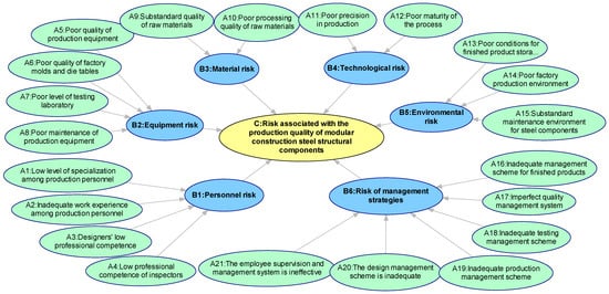 This study utilizes expert interviews and analyses conducted during the production phase of prefabricated components to ensure the universality of the Bayesian network structure employed for assessing quality risks in producing steel structural components for prefabricated buildings. After clarifying the variables of each node and their dependencies, the foundational architecture of the Bayesian network for quality risk factors in steel structural component production was established. In this network, root nodes are represented by green fill, intermediate nodes by blue, and target nodes by yellow highlighting, as shown in Figure 4.