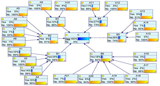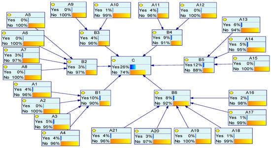 The conditional probabilities of the leaf nodes and the target nodes are determined using the noisy-OR gate model. To elucidate the calculation process, “Environmental Risk ()”, which has three parent nodes, is employed as a case study. The detailed process is outlined Table 8. This discussion focuses exclusively on the derivation of conditional probabilities, omitting the initial aggregation of fuzzy numbers, which are detailed for other leaf and target nodes in Table 9.