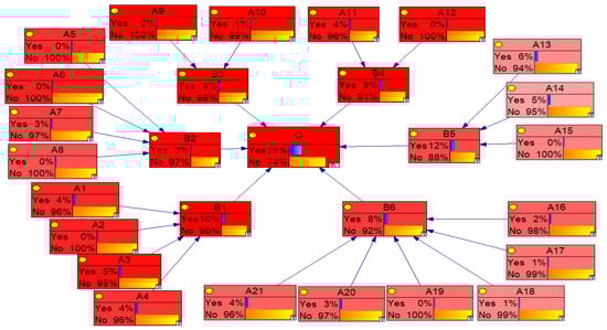 Following the derivation of prior probabilities for root nodes and conditional probabilities for leaf and target nodes using the method described above, these probabilities are uploaded into the GeNIe4.1 software. This facilitates the establishment of probabilistic connections among the nodes, culminating in a Bayesian model for assessing quality risks associated with the production phase of prefabricated building steel structural components, as depicted in Figure 5.