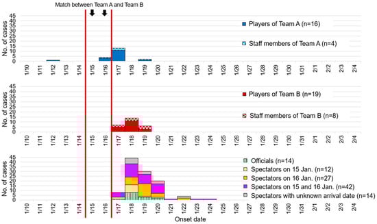 On 15 and 16 January 2022, Asia League Ice Hockey Games (the Games, abbreviated here) were held and the members of two teams (Team A and Team B), the officials in the Games, and the spectators were infected. As shown in Figure 1 and Table 1, players and staff members of teams were the first to develop COVID-19, followed by SARS-CoV-2 transmission among officials and spectators. Out of the 172 infected persons, 102 were spectators (59% of all infected persons), and all 42 players were infected (100% positivity rate). The virus was classified as the Omicron variant (BA.1.1.2) by genomic analysis. As shown in Figure 2, positivity rates among spectators varied depending on the location of the seats on both 15 and 16 January 2022. The rate was from 0% (I) to 29% (A, B) and the number of infected persons was particularly high on the west side near the player benches.