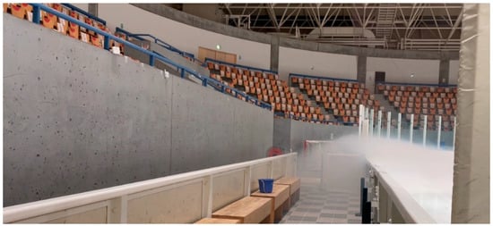In the verification of the ventilation measures against COVID-19 transmission through the air, an exhaust fan was set in the low part of the west side to prevent aerosol diffusion from the ice rink and player benches to the spectator seats. Smoke was used in the verification, and a significant effect was recognized. However, there is a possibility that air stirred by players’ movements in the game, ice-making, spectators’ movements and other environmental conditions could affect the effect of an exhaust fan.
