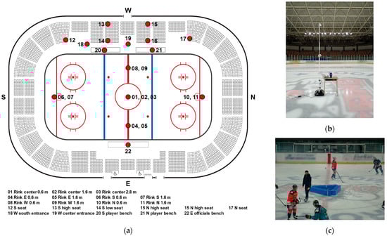 Measurement points: (a) Floor plan; (b) center of the ice rink; (c) reproduction of ventilation characteristics at the outbreak of infection.
